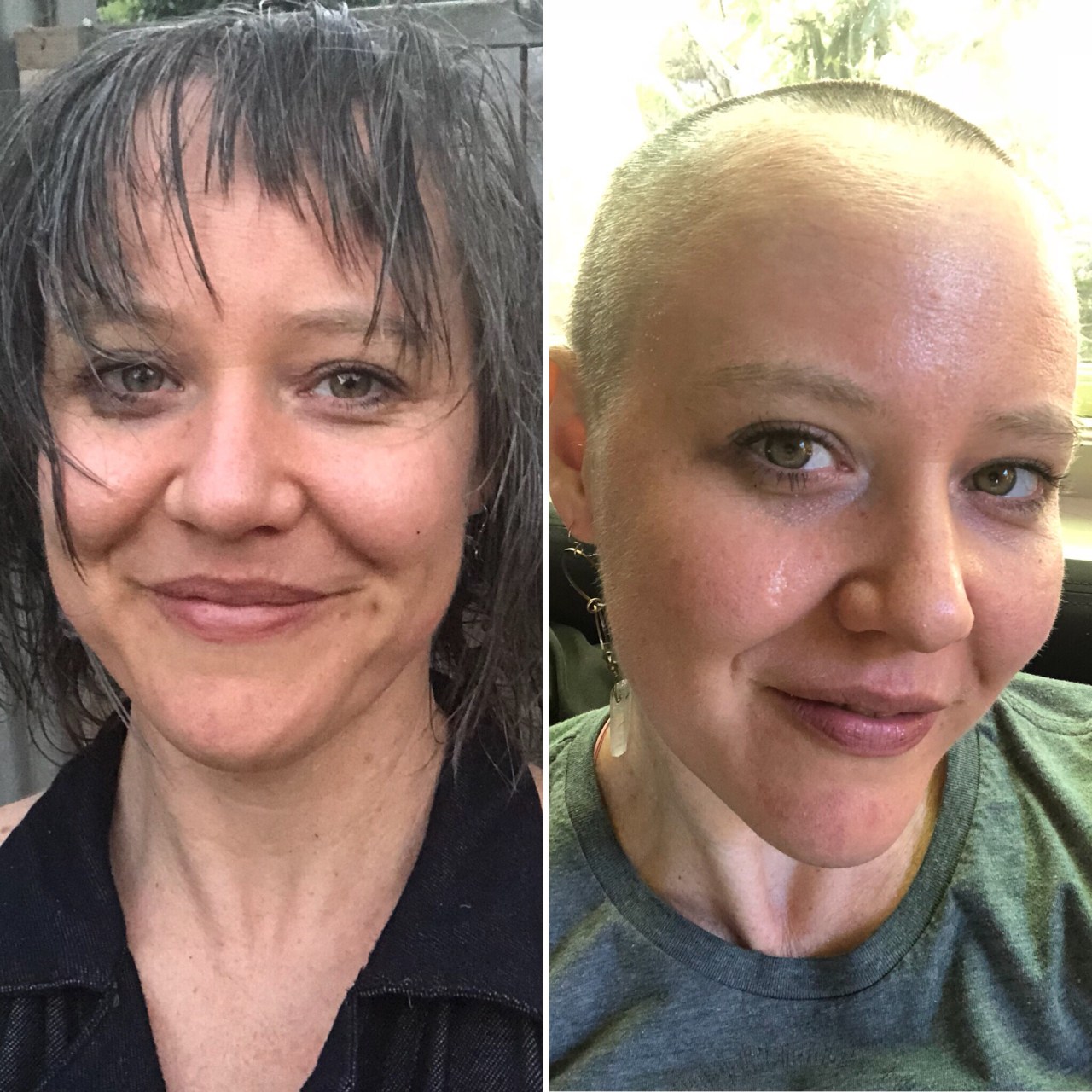 I went out into the world this morning hairless for the first time– and luckily I was going to my studio, where I was met with nothing but love. It was the perfect soft landing surrounded by my community. My next stop was Fred Meyer– where I ran into a dear friend of mine and her daughter. Again, they gave me immense love. Wrapped in the blanket of love from my studio community and my friends I approached the check out line and used that love as a shield for the weird stories my cashier was telling himself about me in his head. I wasn’t privy to the specifics of his stories– but I clearly made him uncomfortable. He avoided looking at me or making eye contact while he served me. Though I caught him looking at me suspiciously when he was waiting on the customer in front of me. I don’t know what to say about that except that it has nothing to do with me. My shaved head brought up something for him that he wasn’t comfortable looking at. I just happened to get caught in the crossfire.